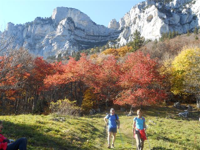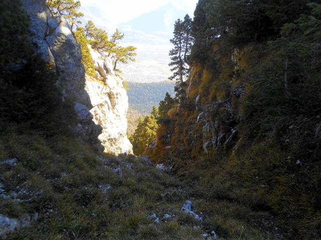 Nous rebroussons alors chemin afin d’observer un goulet dans lequel il me semble distinguer de nombreuses traces de pas. Le sentier assez raide n’inspire pas le groupe mais je décide d’aller en reconnaissance, une vingtaine de pas de désescalade, l'herbe est sèche et très glissante, mais 15 mètres plus bas, je me retrouve sur le bon sangle (flèche rouge) !