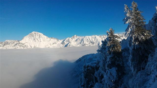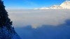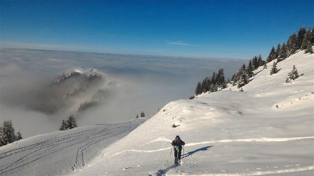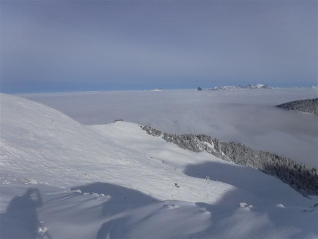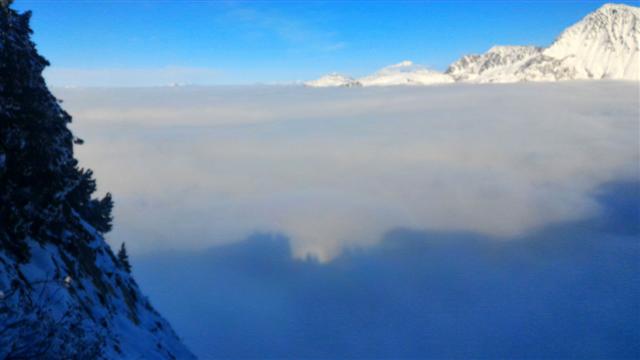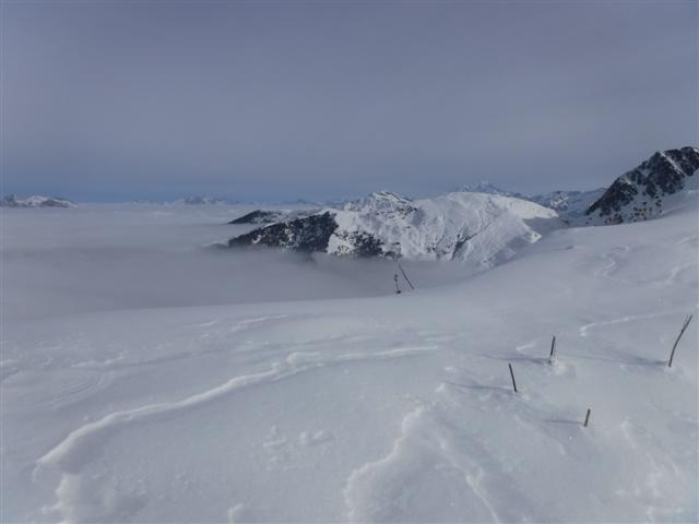 Bel éclairage d'après-midi, ciel bleu, mer de nuages, spectre de Broken dans le vallon du Bens, neige pas trop lourde à manier, quelques pierres en traîtres.
