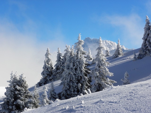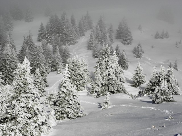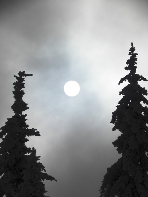 Et le suspens fut total ! La montée se déroula entièrement dans une purée de pois, à ne pas y voir à 20 mètres. Toute la montée ? Non ! Un petit replat peuplé d'irréductibles épicéas résistait encore et toujours à l'envahisseur. Et la vie n'était pas facile pour les garnisons de brumes romaines des camps retranchés de Bariozum, Pouletum, Allevardum et Theysum. Ni une ni deux, je profitais de ce moment pour prendre quelques photos : lune, soleil, neige, Lances de Malissard et arbres givrés. Puis, plus rien, retour dans les abymes blafards et décolorés, où seules les traces d’animaux nous rappellent que la vie s’agite tout autour de soi.