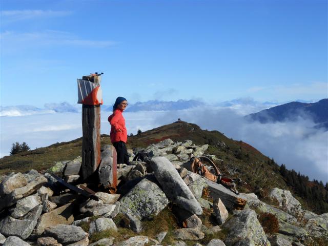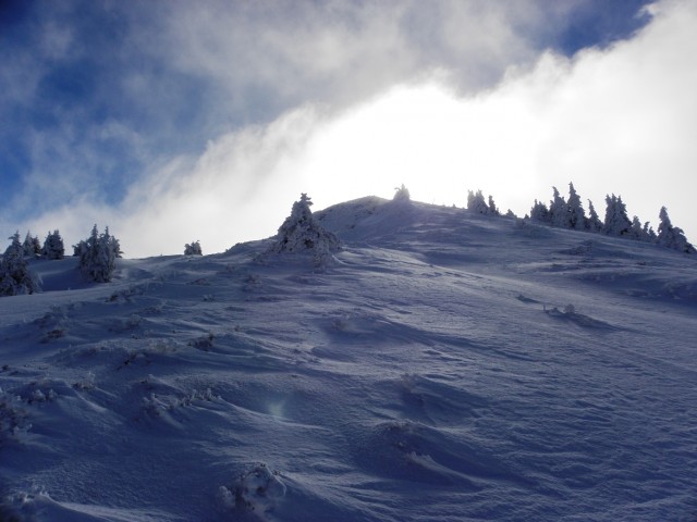 A mesure que je progressais, l’altimètre se rapprochait dangereusement de 1926, point culminant du parcours, et le bleu du ciel se faisait toujours timide. Mais l’espace d’un instant, les nuages se déchirèrent et la Pointe de Comberousse apparut, majestueuse et écrasante, au-delà des quelques épicéas courageux et torturés qui eurent la bonne idée, il y a quelques décennies, de s’installer aux abords de la crête. Peut-être que le Grand Rocher offrira quelques vues ?
