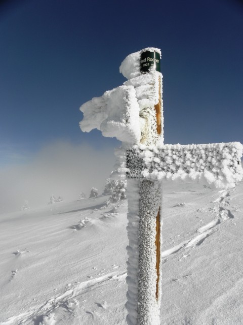 Au Grand Rocher, rien … Une croix, quelques cailloux, une neige balayée par une bise glaciale, et un champ de vision de 20 mètres. Le raquettiste trouvait alors un peu de réconfort dans des gâteaux au chocolat préparés par ses soins, et commençait, semble-t-il à parler de lui à la troisième personne.