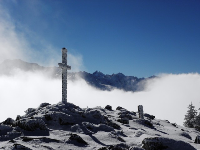 ), premières ampoules dans les chaussures d'hiver, premières gouttes au nez sous le vent glacial de la crête du Grand Rocher, mais surtout premières vues splendides sur les pics saupoudrés de Belledonne, et ce n'était pas gagné !