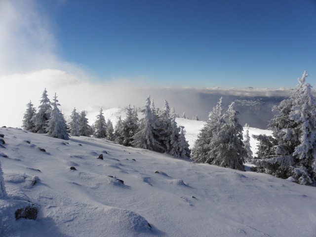 Mais il fallait tôt ou tard retourner au foyer de ski de fond, et redescendre de quelques mètres pour plonger dans cette blême mer de nuages qui me narguait. Je râle, mais le retour fut très plaisant : les images des montagnes enneigées se baladaient dans un coin de ma tête, aucune trace n’était présente entre le Grand Rocher et le Crêt du Poulet, aucun bruit autre que les raquettes qui écrasaient le manteau neigeux, une biche qui ne m’avait pas senti arriver détalant à tout allure à quelques mètres.