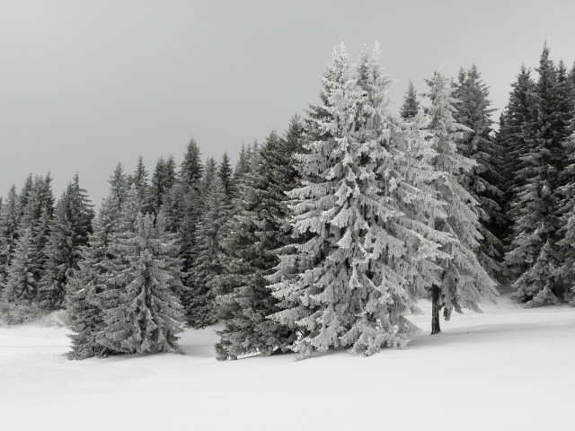 Bon ... quitte à être monté ici sans pneus neiges, autant partir à l'aventure ! Au pire, ce sera un paysage feutré, calme et propice à dissoudre les idées noires dans un manteau blanc. Au mieux, la même chose, mais avec un soupçon de pics et de pointes. Direction le Lac de Crève-Cœur, le Chalet de Pierre Roubet, la forêt un peu au pif, les crêtes et finalement le Grand Rocher.